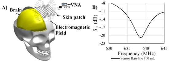 Electromagnetic sensors detect volumetric changes in layered material as shifts in the resonant frequency due to changes in the effective permittivity [28,29]. In regards to non-invasive electromagnetic intracranial fluid shift detection, the substrate composition of blood, brain tissue, and cerebrospinal fluid in the cranial cavity act as a layered substrate material. When the fluid volume changes in these layers, the effective permittivity of the substrate interacting with the electromagnetic field of the resonant sensor produces a change in the resonant equivalent inductance and capacitance causing a shift in the resonant frequency response. Thus, changes in the substrate, such as an increase in blood volume without a corresponding CSF decrease, are associated with shifts in the effective electric permittivity which is detected using the sensor and quantified through the S11 reflection coefficient. In our previous work [21], we further outlined the theory and operating principles.