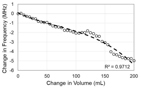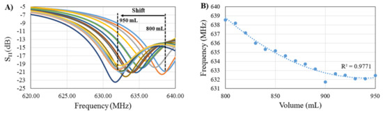 (A) Sensor signal response due to volume change. Each line color represents the sensor signal response at a different volume level; (B) Correlation between principal resonance frequency shift and volume change.