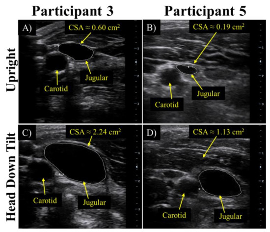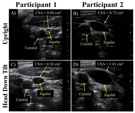 For the 70 s head down tilt at 50°, validation of the cephalad bio-fluid shift was determined by the cross-sectional area data obtained from ultrasound of the jugular vein as seen in upright position for (A) participant 1 and (B) participant 2, and for head down tilt for (C) participant 1 and (D) participant 2.