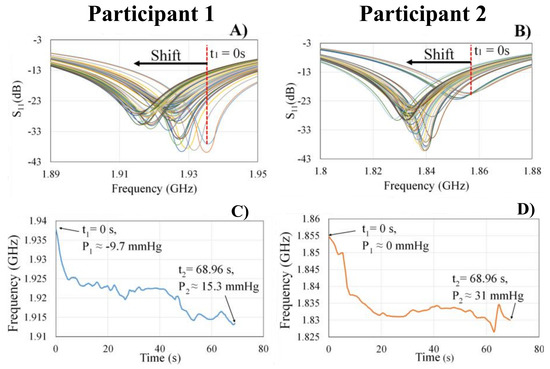 The sensor’s signal response corresponding with a cephalad bio-fluid shift was seen as shifts in the sensor’s principal resonant frequency in (A) participant 1 and in (B) participant 2. Each line color represents the sensor signal response at different times during the bio-fluid shift. The resonant frequency shift during an induced bio-fluid shift over time for (C) participant 1 and (D) participant 2.