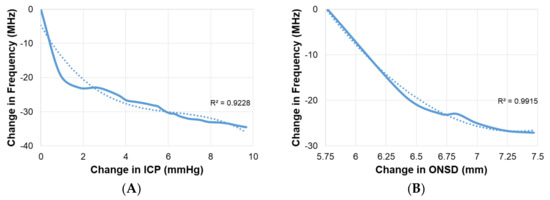 (A) Correlation between intracranial pressure (calculated using optic nerve sheath diameter) and principal resonant frequency shift; (B) Correlation between optic nerve sheath diameter and principal resonant frequency shift. The dotted lines are trend lines.