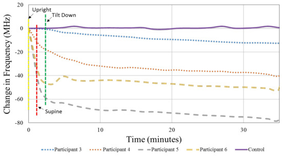 Additionally, over the course of the 30-min head down tilt, the increased bio-fluid volume in the cranial cavity corresponded with a negative shift of the resonant frequency for all four human participants (Figure 12), whereas the control remained close to 0 (within ±1.2 MHz). Figure 12 represents the shifts in resonant frequency over time after a 20-point moving-average filter to smooth the data. The average shift in the resonant frequency from the upright position (time = 0 min) to the end of the 30 min head down tilt (time = 35 min) was approximately 45.07 MHz.