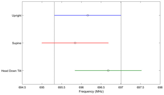 Assessment of the repeatability of the sensor readings from the mannequin in multiple postures was obtained and statistically analyzed. For the three days, the average and standard deviations of the resonant frequency over ten sweeps in the upright, supine, and head down tilt positions were 696.16 ± 1.03, 695.84 ± 0.73, and 696.68 ± 1.08 (MHz), respectively. An ANOVA was conducted, followed by a Bonferroni adjusted multiple comparison test which indicated that there were not significant differences (p > 0.05) in resonant frequency resulting from postural changes, shown in Figure 13. Additionally, the change in temperature from 35 °C to 39 °C resulted in a total shift of less than 100 kHz. Significantly less than the magnitude of shift in resonant frequency due to increase in fluid volume.
