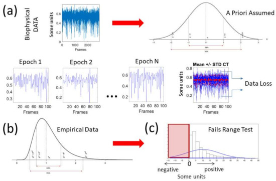 Incorrect statistical assumptions about biophysical data. (a) Time series of biophysical data are often analyzed using theoretical assumptions of normality that do not correspond with actual data. Conventionally, epochs of data are stacked up and a Gaussian mean is used to summarize the data range and its variations, thus smoothing out as noise relevant fluctuations and incurring in gross data loss; (b) Very often, the empirical distributions and/or their fluctuations are not symmetric. (c) The empirical data may fail the range test, while parametric statistical tests and further inferences are based on assumptions of normality (i.e., symmetric distributions).