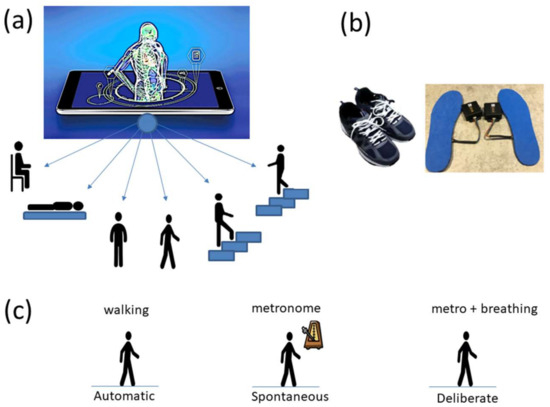 Commercial Sensors (Zeblok, Ridgefield, NJ, USA, smart shoes): One data set from one participant consists of 6 activities (WALKING, JUMPING, STEPPING AROUND OBSTACLE, STEPPING OVER OBSTACLE, WALKING ON A TREADMILL and RUNNING ON A TREADMILL.) Another data set from the same participant consists of three variants of the walking task. The participant in these sets wore Zeblok smart shoes which are commercially available. The shoes have IMU (inertial measurement unit) that collect data at 150 Hz (specs can be found here http://www.zeblok.com/). Figure 2b shows the insoles the participant wore inside regular tennis shoes (removing the original insole and replacing it with the Zeblok one.) Figure 2c shows the schematics of another set of tasks previously described [13], designed to probe the levels of control of the nervous systems: (1) natural walking (baseline) to probe ‘automatic control’; (2) metronome condition whereby a metronome is set in the background to probe ‘spontaneous control’, i.e., test if the biorhythms of the person spontaneously entrain with the metronome’s rhythm and to test if the brain is capable of spontaneously adapting to the new tempo; (3) breathing condition where the person is instructed to deliberately breathe to the metronome’s beat and we test the level of ‘volitional control’ of the person over their gait motions.