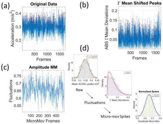 Pipeline of data analyses to construct the micro-movement spike trains. (a) Raw acceleration data with peaks marked by red dots (each peak is detected by a change in the slope from positive to negative trend). (b) Overall mean is empirically estimated and the absolute deviations are obtained and plotted for each frame. (c) The peaks are extracted and normalized using Equation (2). (d) Distributional analyses are performed to determine the best continuous family of distributions at each step fitting the frequency histograms of fluctuations in peak amplitude or peak timing.