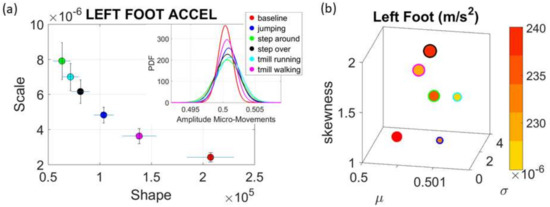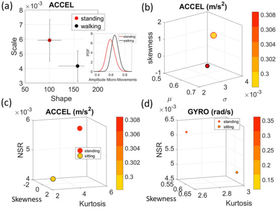 The normalized peak amplitude and peak timing fluctuations represented by real-valued spike trains ranging from 0 to 1, are treated as events in a continuous random process. They are studied under the general rubric of Poisson random processes. Specifically, we use them as input to a Gamma process and estimate the Gamma parameters. We then plot the estimated Gamma parameters with 95% confidence intervals on the Gamma parameter plane (Figure 4a). There we see, for example, that the noise to signa ratio (NSR) is higher for standing than walking and that the walking activity gives rise to more symmetric PDF, also shown in the inset with the corresponding PDFs. We also estimated the Gamma moments and plotted them on a space spanned by the Gamma mean along the x-axis; the Gamma variance along the y-axis; the skewness along the z-axis and represented in the marker size the value of the kurtosis. Since these estimations are performed using the normalized fluctuations in peak amplitudes and timings (independent of the sensor type or participant anatomical features) they span real values from 0 to 1. We retain the physical ranges (m/s2 or rad/s, or seconds) to color code the marker’s face and provide a color-coded gradient showing the range of parameter value (peak amplitude or peak timing) for each participant across each cohort. The color of the marker edge represents the median value of the parameter for activity type or task condition. Figure 4a–d shows the sample graphs for the data in Figure 3. Figure 4c,d identify higher moments of the data to build a parameter space further confirming the separation of the activities along the skewness–kurtosis–NSR dimensions. These types of plots will be used in the rest of the paper to provide instances of methods of parameter identification and data visualization.