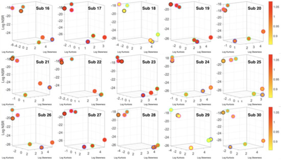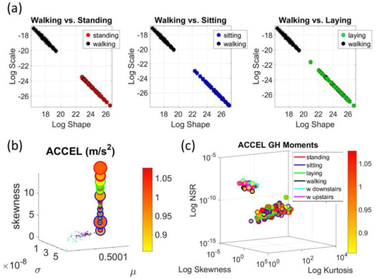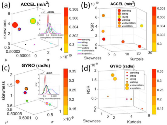 The analyses of the data from the 30 participants revealed separation of activities involving less motion (standing, sitting, laying) from those involving more motions (walking, walking upstairs and walking downstairs.) This separation was evident in the micro-movement spikes derived from the fluctuations in the timing of the acceleration peaks and those from gyroscope angular speed. Figure 5 focuses on the timing data for the accelerometer for each participant. Figure 6a shows sample pairwise comparisons for these activities requiring fewer motions in relation to walking. Each dot represents a participant with tight 95% confidence intervals for the estimated Gamma parameters. Similar results were obtained for the timing of peaks in angular speed. The amplitude data showed some overlapping in the accelerometer case and more separation in the gyroscope case (not shown). Figure 6b shows the Gamma moments of all activities for all participants, with a clear separation expressed in the skewness and kurtosis (size of the marker) between the two classes of activities across the cohort. Figure 6c focuses on the separation along the NSR dimension using as additional dimensions the information that skewness and kurtosis provide. The activities involving walking, walking upstairs and walking downstairs, clearly clustered apart from those involving standing, sitting and laying. Note here that these clusters self-emerged from the stochastic signatures and the moments empirically derived from the variability inherent in the data. They were not obtained with ML clustering methods (e.g., K-means) or using predetermined training/testing sets and assumed similarity metrics to measure distance between neighboring points. Each marker represents a probability distribution function corresponding to the spikes train representing the inter-peak intervals of the participant’s acceleration peaks.