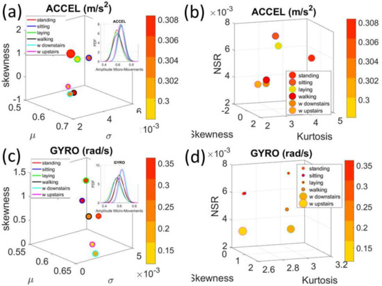 In the gyro case reflecting fluctuations in amplitude of angular rotation, the activities also separate, but have no clear pattern as shown in the acceleration case. Figure 7c shows the differences in estimated Gamma moments using similar convention as above. Here the levels of angular rotation are highest during walking downstairs and lowest during laying, which also has the lowest skewness. Insets show the estimated PDFs. Further, the parameter space of skewness, kurtosis and NSR for the angular speed data produces the separation between the two movement classes reflected in these activities. The size of the marker echoes in this case the range of values (in rad/s) for each activity type. Larger rotational ranges in walking, walking upstairs and downstairs, contrast with those in the activities involving minute covert motions in Figure 7d.