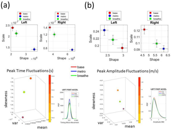 To ascertain these possible effects on the variability of the data at this micro-level, we examined once again, the fluctuations in peak amplitude and peak timing. The latter consistently shifted the signatures of the left and right foot. This can be appreciated in Figure 11a on the estimated Gamma parameters. The former had different effects on the left and right foot Figure 11b. In both the timing and amplitude, we also examined the Gamma moments (plotted for the left foot on the bottom panels of Figure 11). We found marked differences across all parameters, with the metronome condition displaying the lowest variability and lowest NSR of all three versions. Remarkably, the insoles picked up these very subtle changes and systematically differentiated automatic from spontaneous from deliberate modes of control.