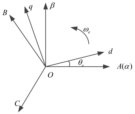 In order to simplify the mathematical model of three phase PMSM in the natural coordinate system, the coordinate transformation usually includes static coordinate transformation (Clark transformation) and synchronous rotation coordinate transformation (Park transformation). The relationship between them is shown in Figure 1, in which ABC is a natural coordinate system, , is a stationary coordinate system, and is a synchronous rotating coordinate system.