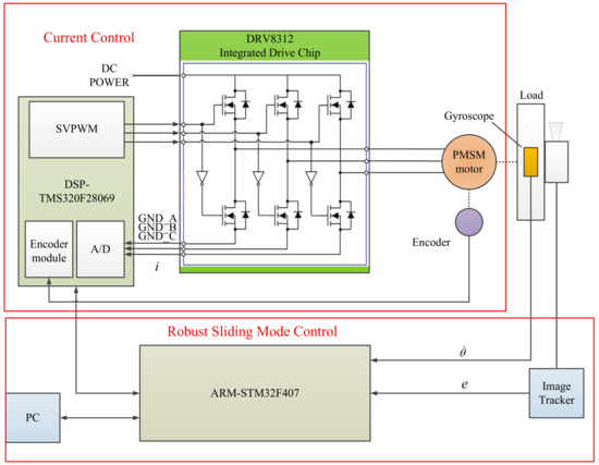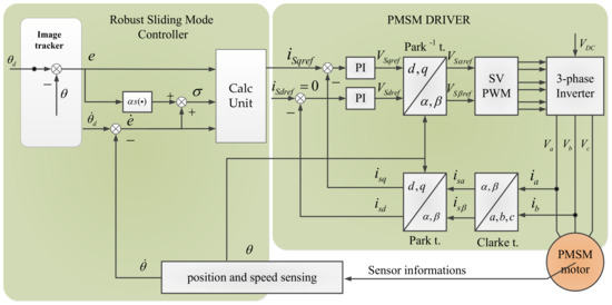 The overall block diagram of the robust sliding mode control is shown in Figure 2. The field-oriented control (FOC) method is utilized to control the PMSM. The robust sliding mode controller is employed as the speed controller to generate the -axis reference current . In order to obtain maximum electromagnetic torque, is always assigned to zero. is measured by an image tracker, and are measured by a gyroscope and an encoder, respectively.