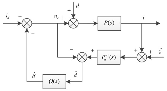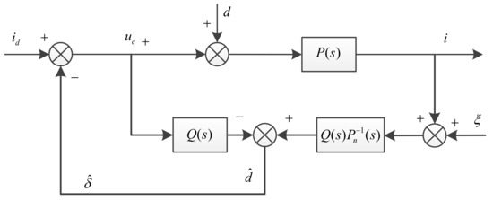 In the above proof we notice that the switching gain needs to be greater than . Generally, and can be obtained or estimated from actual system, but we cannot obtain the exact values of , because it is not only related to the parameters of the motor itself, but also many factors, such as the tightness of the mechanical installation and the disturbance caused by the cable, and so on. In order to make the system stable, we usually use a high gain, but excessive gain will easily cause the chattering of the system. Thus, a natural idea is that if we observe the disturbance and compensate it in the system, the buffeting effect of the system can be greatly reduced. Equation (14) can be drawn as Figure 3.
