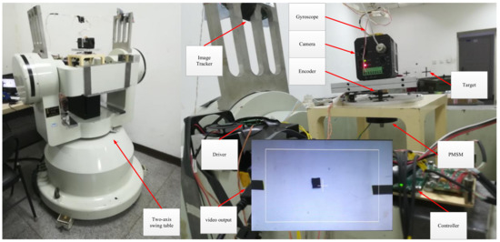 The composition of the experimental system is shown in Figure 7, whereas Figure 8 shows the photograph of the experimental platform. The experimental system was mounted to a two-axis swing platform which was used to simulate the disturbance of the aircraft to the system. It is composed of a permanent magnet synchronous motor, a single-axis gyroscope, an off-axis encoder, driver, and acquisition circuit, control circuit, image tracker, visible light camera, and so on. The parameters of the tested PMSM is listed in Table 1. The high-precision single-axis gyroscope is employed for measurement of the angular velocity of the relative inertial space of the motor. In order to reduce the effect of friction on the shaft of the motor, an off-axis encoder was used. Unlike the photoelectric encoder, it works by using the principle of magnetic induction. The resolution ratio of the encoder is degrees and it is an absolute encoder. Angle detection is realized using the DSP (TMS320F28069) through the SPI interface and speed detection is realized using the ARM (STM32F407) through the RS422 serial port. The sampling frequency for the angle and current is 8 kHz, whereas the sampling frequency for the gyroscope is 2 kHz with a baud rate of 921.6 kbps. In this experimental system, DSP is mainly used to control the integrated drive chip DRV8312 in the current loop. The control strategy proposed in this paper is mainly implemented in ARM. The serial communication time of the DSP and the ARM is 1 ms. All programs are programmed in the C language.