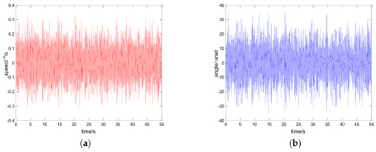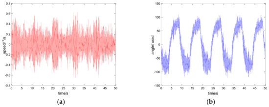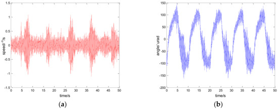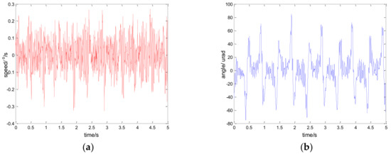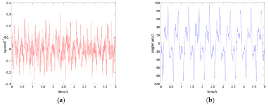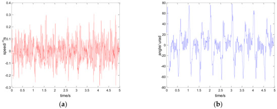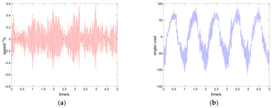 The experimental results of the PI, robust SMC with Euler, and robust SMC with NTD under the disturbance are shown in Figure 9, Figure 10 and Figure 11. Figure 9a, Figure 10a and Figure 11a show the speed signal of the gyro output, and Figure 9b, Figure 10b and Figure 11b show the tracking error obtained by integrating the speed signal. The tracking error shows the inertial tracking capability of the system. The RMS value of the tracking error is used for compared. The formula for calculating the RMS is: