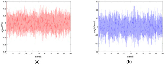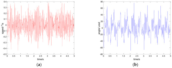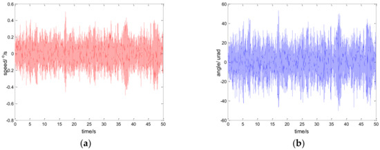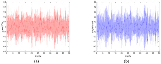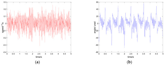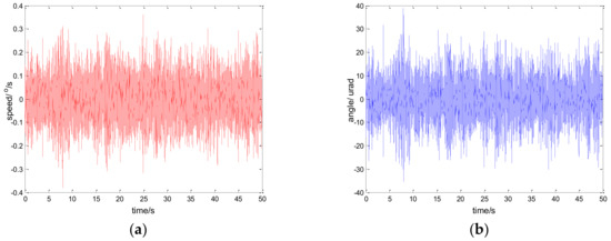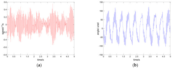 Figure 12, Figure 13 and Figure 14 show the experiment results in medium angle low frequency disturbance signal with the maximum acceleration of ; Figure 15, Figure 16 and Figure 17 show the experiment results in the large angle, low-frequency disturbance signal with the maximum acceleration of ; Figure 18, Figure 19 and Figure 20 show the experiment results in small angle, high-frequency disturbance signal with the maximum acceleration of . In addition, is the small angle, medium-frequency disturbance signal with the maximum acceleration of .