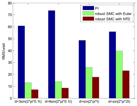 From the experimental results presented, it is evident that the proposed robust SMC with NTD has obvious advantages. For a more intuitive comparison, the RMS value column diagram of the tracking error under different disturbance conditions is shown in Figure 21. What is worth paying attention to here is that when only the PI method is compared, the RMS value of the tracking error under the disturbance of and with small maximum acceleration is even higher than the others. This is due to the existence of friction and other disturbances in the system, and the other two methods, due to the use of the disturbance observer, this phenomenon is well suppressed.