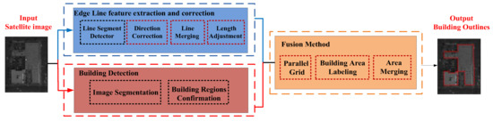 Owing to buildings having parallel or vertical edges as the key attribute, we propose a fusion method to extract the building outlines under line constraints based on edge line feature extraction and building detection. The proposed fusion method is divided into the following three steps: (1) parallel grid generation; (2) building area labeling; (3) area merging.