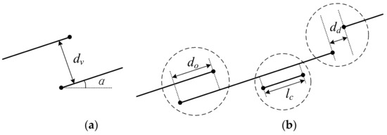 (2) Line merging: After the direction correction, the line segments are still just parts of edges and they need to be linked. There is one premise and three criteria for merging procedure, which are shown in Figure 3. Once the premise and one of the criteria are satisfied, the two segments are merged.