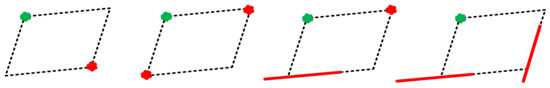 (1) Parallel Grid Generation: For the line segments extraction results, assume that the number of lines in the primary and secondary direction is m and n, respectively. The original image can be simply divided into (m + 1) * (n + 1) parallel grids by all the edge segments. However, the grids are too small to cause the outline extraction overly to depend on the building detection results. Therefore, not only the edge segments but also the potential building corners are used for parallel grid generation in our method. As is shown in Figure 5, the green dot is a potential building corner as a start point of parallel grid searching. Figure 5 shows four cases to construct a parallel grid by searching along the primary and secondary direction: