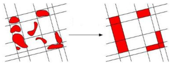 (2) Building Area Labelling: After the parallel grid generation, every grid needs to be labelled by the building detection results. The labelling results are computed by the total pixel number of each grid Pa and the building pixel number of each grid Pb. When Pb/Pa > T4, the whole grid is labelled building area, as shown in Figure 6.