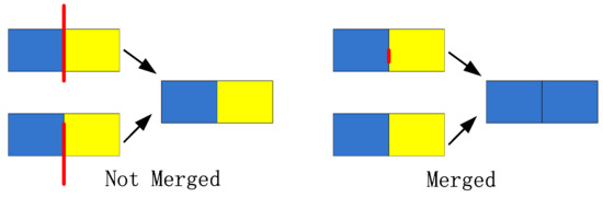 (3) Area Merging: Although the excessive segmentation problem of parallel grids is considered, there are still two adjacent grids belonging to the same building. As is shown in Figure 7, blue grid and yellow grid represent two adjacent grids and red lines are the edge segments extracted in the previous step. The length of the edge segment is l and the length of the grid edge is l’. When there is one extracted edge segment between two adjacent grids and l > l’/2, the two adjacent grids cannot be merged; when there is no extracted edge segment or l ≤ l’/2, the two adjacent grids should be merged.