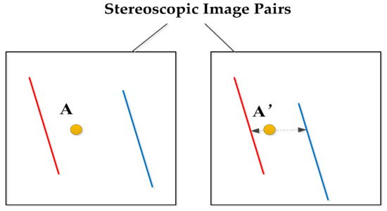 Based on the matched edge lines, the points matching search range are narrowed down. When the point is within the two parallel edge lines of buildings, the corresponding matching point is searched for in two matched parallel edge lines of the other image. It is shown in Figure 9. The point A is between the red edge line and the blue edge line in the reference image. The matched A’ is also searched between the adjacent matched red edge line and the matched blue edge line in another image. Moreover, by the epipolar constraint, A’ is searched only on the dashed line with arrows. When the adjacent matched red line and blue line are the two edges of the same building, A’ is searched only on the roof of the building object. When the adjacent matched red line and blue line are the two edges of different buildings or lines of background, A’ is searched only on the street or other background. Our optimization of matching search scope separates the building object and the background to provide more accurate matching search range.
