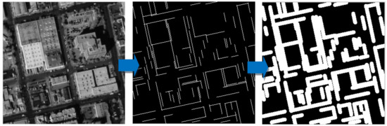 - For edge line extraction, LSD (Line Segment Detector) [21] is employed to obtain basic line detection. In addition, for edge correction, an improved line adjustment method is proposed to correct the edge segments fitting buildings closely.