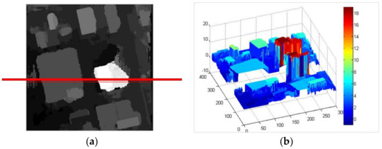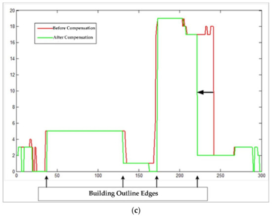 After the edge constraint, the matching errors at the building edges are greatly decreased, but the structure features of building in the disparity map cannot be obtained. The accurate outlines with building structure feature are obtained by our fusion method, which can compensate the disparity map of building objects by post-processing, as shown in Figure 12. Figure 12a is the disparity map after the edge constraint, and the red line represent to select any one row of the disparity map. Figure 12b shows the 3D display of the disparity map, and it is split at the selected row. The process of outline compensation is shown in Figure 12c. In Figure 12c, the red curves are the profile of the 3D disparity map on the selected row, and the green curves are the profile of building outlines at the corresponding position in the 3D disparity map. Because the building outlines by our fusion method are accurate, which can keep the building structure features with parallel or vertical edges. All the building edges of the disparity map after the edge constraint are adjusted the same position with building outline extraction results. In other words, our outline compensation method makes the disparity mutation occur at building edges, which can keep the building structural attribute of the disparity the same as the building outline extraction results. It can further improve the building structural attribute of the disparity, and greatly decrease the matching errors caused by elevation discontinuities at the building edges.