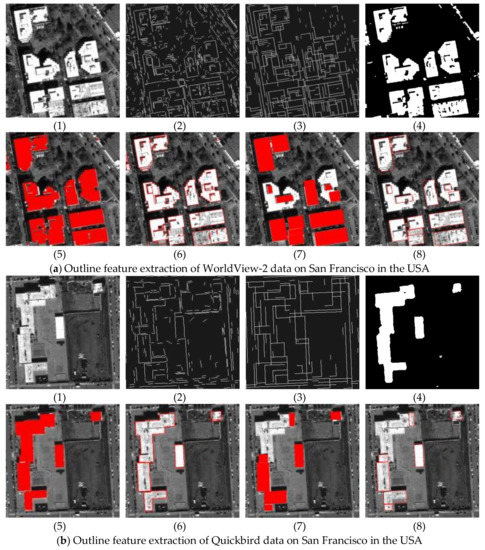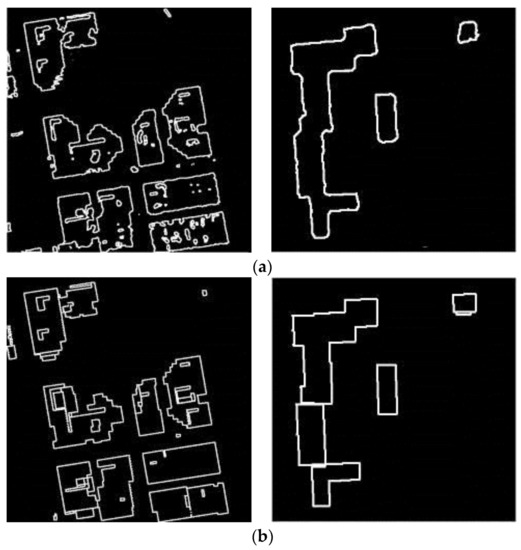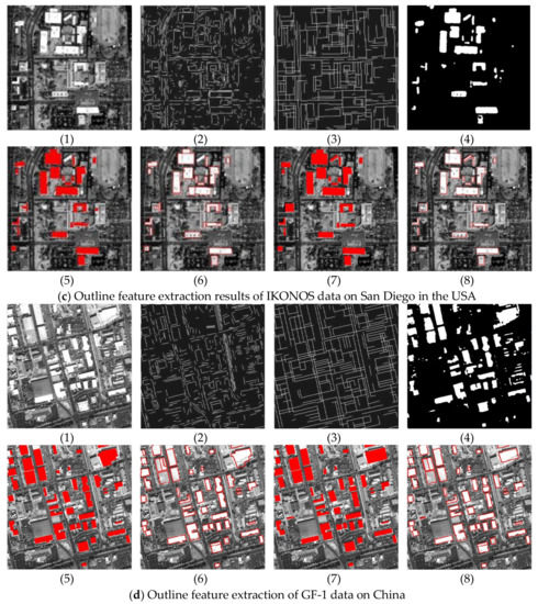 It is also worth noting that the experiment Figure 13d is conducted on the GF-1 satellite image with 2 m resolution. For the results, it is obvious that the resolution of the image is lower to influence straight line features. Therefore, 2 m resolution may be the limitation for the high-precision building outline extraction with straight line features.