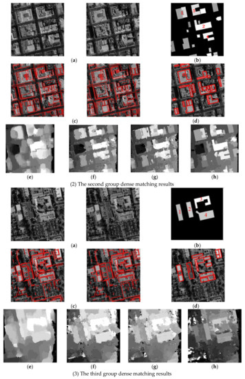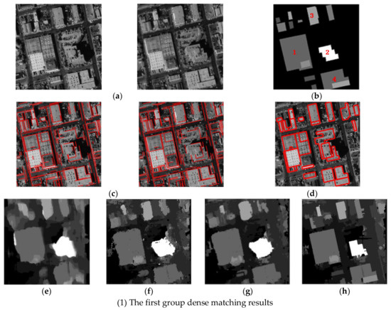 The comparative experiment results of matching disparity map, (a) the original stereoscopic image pairs, (b) the truth of building objects in the disparity map, (c) edge line matching result, (d) building outlines by our fusion method, (e) matching results by Di’s method [12], (f) matching results by J’s method [13], (g) matching results by A’s method [18], (h) matching results by our ECAOC method.