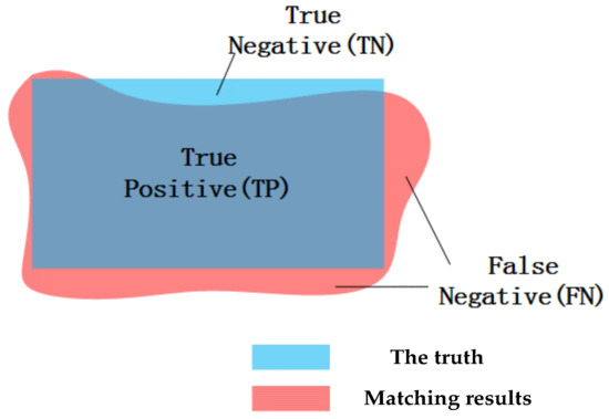 In quantitative evaluation, we proposed the object accuracy to evaluate the matching precision of every object, as shown in Figure 16. The blue area is the truth of the disparity map, while the pink area is the matching results by some methods. The successful matching points in every building object belong to the True Positive, when they meet the following two conditions. (1) The difference between the matching results and the truth of disparity map is less than 1 pixel; (2) The successful matching points of results is within the range of the truth. The points belong to False Negative, when they are in the matching results not in the truth. In addition, the points are True Negative, when they are in the truth not in the matching results. This evaluation index of object accuracy not only describes the matching accuracy of every object but also describes the shape accuracy of the matching results. The object accuracy can be computed as