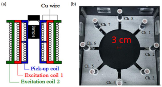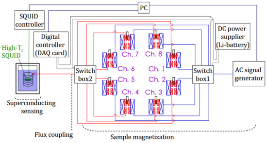 For each coil set, excitation coils were driven using an ac signal generator, which generated two independent ac voltages at two frequencies, f1 and f2, to excitation coils 1 and 2, respectively. The mixed frequency of f1 + 2f2 at approximately 20 kHz was used to suppress signals associated with no samples [5]. The ac magnetic signal that resulted from magnetized samples was detected using the pick-up coil and guided to the flux-coupling component. The eight coil sets were activated sequentially. To manipulate the activation of each coil set, electric switches were cascaded between the ac signal generator and excitation coils as well as between the pick-up coil and flux-coupling component, as indicated by switch boxes 1 and 2 (Figure 1).