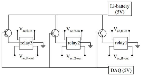 The circuits of the electric switches are illustrated in Figure 3. Each coil set contained three switches, and each switch comprised one low-noise bipolar junction transistor (BJT) (C1815, UTC, New Taipei City, Taiwan) and one low-noise relay (G6K-2P-Y, Omron Corporation, Kyoto, Japan). The low noise BJT was as a buffer to isolate the DAQ noise from pickup coil and the input coil surrounding the SQUID sensor. It efficiently improved the automatically adjusted time for the unlock states of the SQUID sensor. Relays 1 and 2 (Figure 3) transferred ac voltages from the ac signal generator to excitation coils 1 and 2, respectively. Relay 3 transferred the ac signal from the sample to the flux-coupling component. Activation of the relay was controlled with the BJT, which had a power of 5 V and contained a data-acquisition (DAQ) card (PCI-6221, National Instruments, Austin, TX, USA). The DAQ card output a direct current (dc) of 5 V to the BJT, and the dc voltage generated by the Li battery was applied to the relay. The relay was activated, and either the ac voltage from the ac signal generator was transferred to the excitation coil, or the sample-induced ac signal was transferred to the flux-coupling component. Once the 5-V dc from the DAQ card was stopped, the relay was also stopped. Subsequently, no ac voltage or signal was transferred through the relay. Relays 1 and 2 were inside switch box 1, and relay 3 was inside switch box 2.