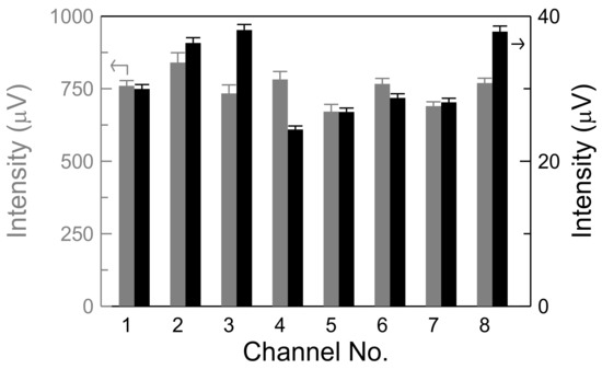 The recording time was approximately 1 min for each channel, much longer than the total measurement time of tens of seconds. Figure 4 shows the recorded signal intensity of the biomarker-free mixture, represented by the gray bar, and the noise level, represented by the black bar. The observation frequency at 20 kHz was within the approximately 1-MHz bandwidth of the controller. Four critical findings validated consistency among these eight channels. First, the time-independent intensity, representative of χac before or without the bioconjugation of target molecules (denoted as χac,0), exhibited a variance of only 7.1%. Second, the noise level ranged from 20 to 40 μV, similar to the noise level for the shorter measurement time of tens of seconds. Third, similar standard deviations were identified between the output signals and the noise level. Fourth, the signal-to-noise ratio for all channels was approximately 24.5, which is sufficiently high for reliable measurement. Notably, all reagents exhibited the same results for the biomarker-free mixture (Figure 4) because the only differences among the three reagents were the bioprobes, which were coated on the same batch of MNPs.