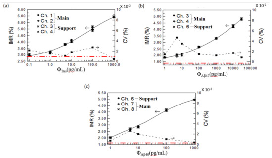 For three measurement rounds of the same biomarker concentration obtained from each main or support channel, the average and standard deviations of IMR values are plotted on the left axes in Figure 5a–c for the tau protein, Aβ42, and Aβ40, respectively. The CV, defined as the ratio of the standard deviation to the average value, was used as the stability indicator in comparison with all obtained IMR values from the various channels for each biomarker. The CV values are plotted on the right axes in Figure 5a–c for the tau protein, Aβ42, and Aβ40, respectively. All CV values for the biomarkers in concentration ranges lower than 5% validated high consistency for the IMR values obtained from the main and support channels. The biomarker ranges for the tau protein, Aβ42, and Aβ40 were 1–30,000, 0.1–1000 pg/mL, and 1–1000 pg/mL, respectively.