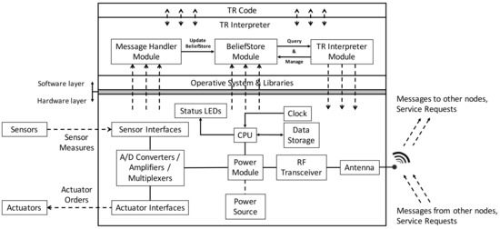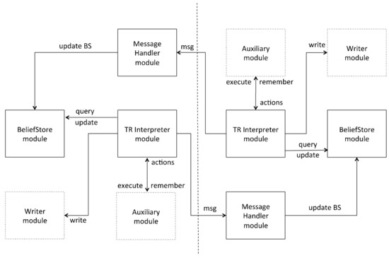 The TR interpreter consists of five different modules and it has been developed from scratch. Figure 4 shows an example of communications between two different IoT TR nodes, in which the TR interpreter has been implemented, and the three main modules involved: the Message Handler, BeliefStore and TR Interpreter modules. This module structure is compatible with those shown in Figure 1 and Figure 2, assuming that communication is by an LCN node.