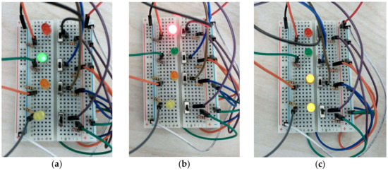 Figure 8 shows the emulation accomplished. The three states are: (a) there are no percepts yet (BS=[]), the robot is alternating between the turn and move actions looking for a bottle; the color green is just at the instant of turning; (b) the user pushes the switch C (BS=[see_bottle]) and then the robot moves forward (red LED) until the user pushes the switch A, indicating that the robot is touching the bottle (BS=[see_bottle, touching]); the robot then opens and closes the gripper to obtain the bottle (these actions and the percept holding have not been included in the hardware emulation); (c) once the user pushes the switch D the robot is over the drop and then opens the gripper, updating the variable _collected (orange and yellow LEDs).