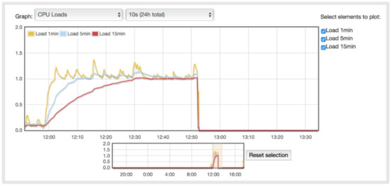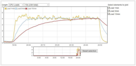 Figure 9 and Figure 10 show the CPU load during the test. Each process using or waiting for CPU increments the load number by 1. The three load average curves refer to the last one, five, and fifteen minutes of system operation. They all decay exponentially, but at different speeds (they decay exponentially by e after 1, 5, and 15 min respectively). As the Raspberry Pi is a single-CPU system, the load average is a measure of system utilization during the respective time period. The Erlang implementation uses the CPU more than the Python, due to the concurrency of Erlang. In this implementation, the system is overloaded by 300 percent on average so that 3 processes had to wait for a turn. The overload is similar for the 5- and 15-min load averages. In the Python implementation, the system is overloaded by 25 percent on average. This difference is due to the Python implementation being sequential, while Erlang has several concurrent processes, which enables faster reactions in dynamic environments but also implies a higher CPU load.