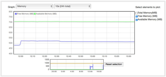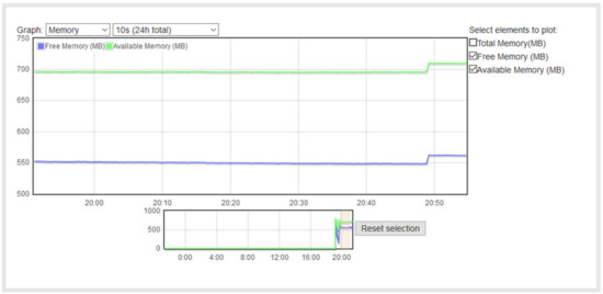 Figure 11 and Figure 12 show the available Raspberry Pi RAM memory, where the total memory is 1 GB. It is shown that the memory usage in both cases is almost the same: 550 MB of free memory and 700 MB of available memory (the free memory is memory that is not being used, but it is actually harder to use because it has to be transitioned from free memory to memory in use, while the available memory can easily be switched to another use).