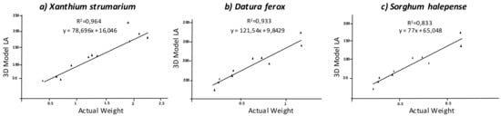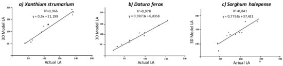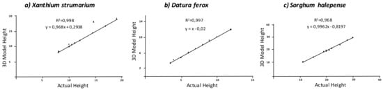 S. halepense. The estimated parameters using the models showed a high correlation with the ground truth data. Indeed, a good consistency in linear correlation equations was found between the estimated parameters by the digital 3D model and the actual values measured in the weed plants. The parameters obtained in the models were highly correlated with the actual values, showing R