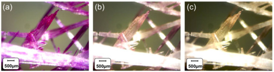 However, the SP monomer synthesised in this research exhibits rapid and reversible room temperature photochromism in the crystal state upon UV/white light irradiation (Video S1). Upon UV light (365 nm) exposure, the colour of the crystals rapidly changes towards purple (Figure 1a; 1 min UV irradiation). Progressive reversal of this process is indicated by decolouration produced by illumination with white light (Figure 1b, 1 min, and Figure 1c, additional 2 min). This effect is observed at room temperature (20 °C). Although the determination of the crystal structure in the two forms was attempted, as in previously reported cases [27], this was unfruitful, most likely because of the disorder arising from the co-existence of both SP and MC forms in the crystal lattice. Further investigation will be carried out to ascertain if photo-conversion takes place at crystal sites under lattice control or is restricted to crystal defects.