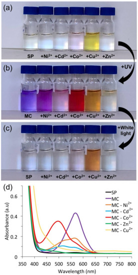 Images (a–c) and UV-Vis spectra (d) of the SP solutions in ACN (1.5 × 10−3 M) in the presence of various divalent metal ions (molar ratio SP:M2+ 2:1); (a) initial solutions before illumination; (b) after 10 min of UV light illumination; (c) after 10 min of white light illumination; (d) UV-Vis spectra of solutions shown in (b).