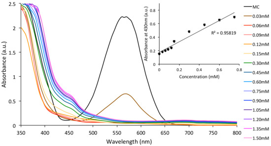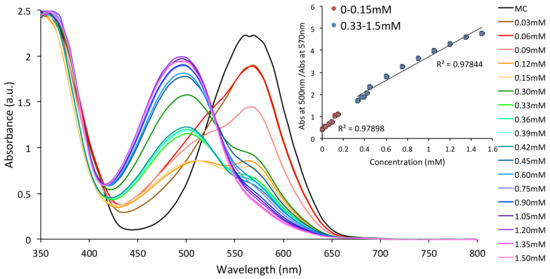 Similarly, the spectrophotometric titration of MC (1.5 × 10−3 M SP in ACN) with Cu2+ (0–1.5 mM) was also investigated under the same conditions (2 min of UV irradiation). In this case, the absorbance band specific to MC (λmax ≈ 570 nm) disappeared completely once the concentration of Cu2+ was increased upon 0.03 mM and a new absorbance band specific to MC:Cu2+ was observed, centred at 430 nm. A linear dependence of this absorbance band (λmax ≈ 430 nm) as a function of Cu2+ concentration was observed (Figure 4, inset). No noticeable difference in the MC binding behaviour was observed when the Co2+ or Cu2 solutions containing 10−3 M Na+. This result is expected, as MC dyes are not known to bind monovalent metal ions.