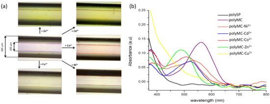 Images (a) and absorption spectra (b) of the coated micro-capillaries when solutions of different metal ions in ACN (10−3 M) are passed through the micro-capillary after irradiation for 1 min with UV light.