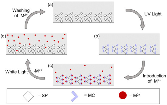 Schematic representation of the metal ion binding, sensing, and release cycle in the SP polymeric brushes coated micro-capillary. (a) polySP coated micro-capillary before irradiation; (b) formation of polyMC upon UV irradiation; (c) binding of M2+ to polyMC coating; (d) photo-controlled release of M2+ upon white light irradiation and regeneration of polySP coating.