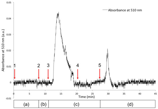 Co2+ was selected for further study on the basis of its very clear spectral shift from free MC to MC:M2+. In addition to the spectral changes inherent to the ion binding and release observable from the coating in the capillary, detection of free Co2+ released from the poly(SP) functionalised micro-capillary upon white light irradiation was evaluated using a post column reaction with 4-(2-pyridylazo)resorcinol (PAR). PAR is a well-known chelating reagent, offering multiple coordination possibilities for metal ions [38,39] through a pyridyl nitrogen, azo group and o-hydroxyl group, as shown in Figure S5. This results in an easily identifiable PAR:Co2+ coloured complex with a λmax at ~510 nm, as shown in the UV-Vis spectra in Figure S6. The set-up used for recording the absorbance at 510 nm before and after irradiation of the poly(MC) functionalised micro-capillary with white light (release) is shown in Figure S7. Figure 7 shows the monitoring of the absorbance at 510 nm (characteristic for the PAR:Co2+ coloured complex) as a function of time. Several stages (1–5) are identified (Figure 7), in relation to the state of the functionalised micro-capillary (Figure 6), as described below: