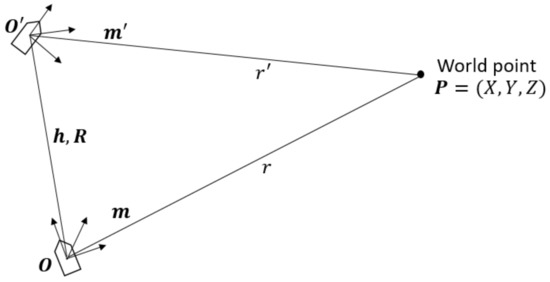 where r and are the distances between the world point P and the camera at location O and , respectively. As proven in [7], solving Equation (6) using the least square method, we can find the optimal solution for r and that minimizes the error between the two sides of the equation. The final solution is obtained as