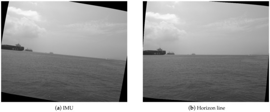 In the IMU (myAHRS+) used in our system, the yaw angle is measured by a magnetometer sensor, which is more reliable. While the roll and pitch angles are measured by a gyroscope and accelerometer, which are less reliable through our comparison in experiments. Figure 3a shows the roll angle corrected image using the measurement from the IMU. It can be seen that the horizon line in the image is not horizontalized well.