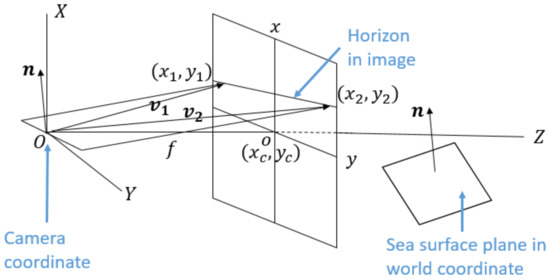 As shown in Figure 4, with the horizon or vanishing line, the normal vector of the sea surface plane in the camera coordinate can be calculated, and it is the same as the normal vector in the world coordinate. Denote the image center as , the focal length of the camera as f, and two different points on the horizon line as and . Thus, the two vectors connecting the origin of the camera coordinate and the two different points on the horizon line are, respectively, and . Hence, the normal vector of the sea surface plane is calculated as the cross product of and : . Finally, the roll and pitch angles of the camera can be computed as
